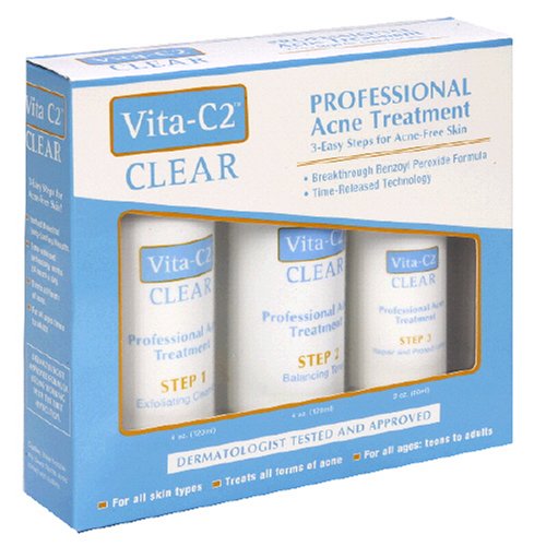 3-Easy Steps for Acne-Free Skin. Breakthrough Benzoyl Peroxide formula. Time-released technology. Dermatologist tested and approved. For all skin types. Treats all forms of acne. For all ages: teens to adults. Why Vita-C2 clear? Compare to other acne treatments: prescription quality; dermatologist tested and approved; active ingredient Benzoyl Peroxide; Time-released formula; Affordable (Save up to 50%); readily available; no shipping charges. 3-Easy Steps for Acne-Free skin! Instant Benefits/Long-lasting results; time released technology works 24 hours a day. Dermatologist approved formula begins working with the first application.