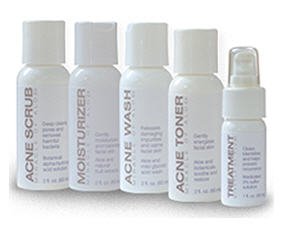 3 Easy Steps to Clear SkinThe Acne Skin Care System Targets various phases of acne life cycle to prevent them from happening, so pimples never form in the first place!Step 1: Clean and Purify Begins with alternating days using our alcohol-free Acne Wash and out deep-cleaning Acne Scrub. These two gentle solutions calm irritated tissues by helping dissolve pore blockages, exfoliating dead skin cells, and helping control potentially harmful surface bacteria that could precipitate a new acne cycle.Step 2: Revitalize and Moisturize, apply our unique botanical and aloe vera based Acne Toner to gently revitalize your skin. It removes excess oils and leaves skin feeling restored. Then follow with our Moisturizer to restore needed fluid and rebalance your skin's natural pH.Step 3: Treat. Break the cycle completely with a light application of our medicated Acne Treatment to areas where acne already appeared of is prone to in the future. A clinically proven acne fighting ingredient, pure natural aloe gel and other powerful healers, work fast to heal acne and prevent future flare ups--GuaranteedKit includes:1 x Acne Wash- Releases damaging impurities and calms facial skin (2 fl oz) 1 x Acne Scrub- Deep cleans pores and removes harmful bacteria (2 fl oz) 1 x Acne Toner- Gently energizes facial skin (2 fl oz) 1 x Moisturizer- Gently moisturizes and balances facial skin (2 fl oz) 1 x Treatment Spray- clears blemishes and helps prevent recurrences (1 fl oz)